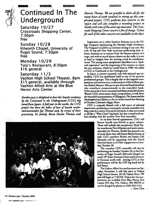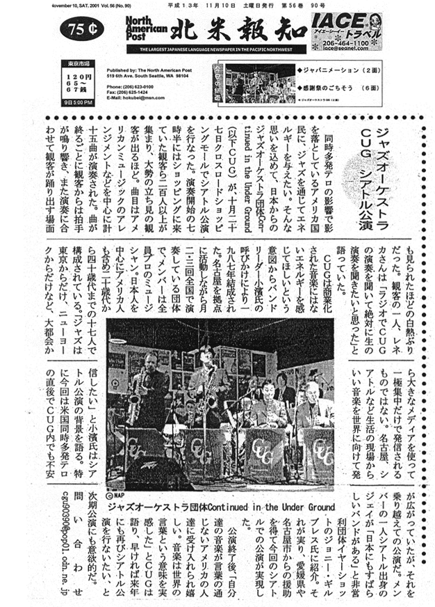 画像で全部紹介すると、大変重いので、文字データを抜粋しました。以下は抜粋文です ジャズのサポートと普及を目的として1984年にシアトルで発足した非営利団体『Earshot Jazz』。同団体は無料月刊誌の発行をはじめ、ジャズについての教育プログラムや特別プロジェクト、そして年間100以上のコンサートの開催など、広範囲に活動していますが、中でもダントツ人気なのが毎年恒例のジャズフェスティバル『Earshort Jazz Festival』です。世界中から100名を超えるミュージシャンが集まり、シアトル各地のコンサートホールやクラブ、コミュニティでジャズの演奏を行います。今回は同フェスティバル初出演ながら演奏4回と、出演者の中では最多のライブをこなした日本のビッグバンド『Continued in the Under Ground Jazz Orchestra (CUG)』をご紹介しましょう。 来米はこれで3度目というCUGですが、Earshot Jazz Festivalへは今回が初めての出演。10月27日、シアトル在住のトランペッター、ジェイ・トーマス(Jay Thomas)とその妻でヴォーカリストのベッカ・ドュラン(Becca Duran)をゲストメンバーに迎え、ベルビューのクロスロード・ショッピング・センターで行われた演奏は大好評。ジャズに詳しくなくても、演奏者たちが心からジャズを愛し、演奏することを楽しんでいる雰囲気が感じられるエネルギッシュなパフォーマンスに、ステージの周りは人だかり。軽快なリズムのジャズナンバーに合わせてダンスをするカップルや、手をとりあいながら笑顔で曲に聴き入る老夫婦など、微笑ましい光景があちこちで見られました。 後日、バンドリーダーの小濱安浩(こはま・やすひろ)さん(サックス)にお話を伺うチャンスに恵まれ、今回のイベント参加、そして音楽に対する考えをお話ししていただきました。 小濱さんが音楽を始められたきっかけはなんですか? 独学でテナーサックスを学んでいたのですが、1987年にニューヨークに音楽の勉強をしに渡米した際、ビレッジヴャンガードという世界で最も有名なジャズハウスでメルルイスというジャズ・オーケストラの演奏を聴くチャンスに恵まれました。彼らの演奏にものすごい感銘を受け、それを日本で再現したい思い、1989年にCUGを結成しました。 CUGの活動内容を教えてください。 メンバーは全部で20人。名古屋を中心に活動しているレギュラーだけで16人います。普段は名古屋近辺のクラブで年間25〜30回ほどのギグを行い、日本国内ツアーもします。現在出しているアルバムは1枚。このフェスティバルの後にシアトルで2枚目のアルバムをレコーディングする予定でしたが、レギュラーの内4人が参加できなかったため、来年の春に日本で仕上げる予定です。 Earshot Jazz Festivalに参加されたいきさつ、また、今回メンバーに迎え入れたジェイ・トーマスやベッカ・ドュランとの関係について教えてください。 1998年頃、仕事で来日していたジェイと、僕がサックスを教えている名古屋の楽器店で知り合いました。いろいろと話しているうちに親しくなり、CUGの日本ツアーにも参加するぐらい、ジェイは僕たちの音楽を気に入ってくれ、「日本にはこういうバンドがいる」ということをぜひアメリカに紹介したい、と今回のフェスティバルに誘ってくれたのです。同じ頃、NHK放送のコンサート出演をはじまりとしてあちこちのメディアに顔を出すようになり、「自分達の音楽が商品として成り立つんだ」という自信が生まれてきていました。そこで、それまではただジャズが好きでやっていましたが、「それならもうちょっと責任のある仕事をしよう」「もっと社会に貢献できるような活動をしよう」と思うようになったのです。今回のフェスティバルへの参加はその後の活動と業績を認めてくださった芸術文化振興基金からの助成金によって実現しました。クラシック音楽には助成金が出ていましたが、ジャズ音楽に関しては僕たちが初めて。いわばパイオニアになれた、という感じです。 これもすべてジェイたちのような心優しい、音楽を愛するミュージシャンとの縁があったからこそと思っています。 アメリカ(シアトル)での演奏と、日本で演奏される時と、違いはありますか。また、あるとしたら、どんな風に? アメリカでは、お客さんの反応がいいですね。子供も大人も、体で音楽に反応してくれているのがわかる。今の日本ではジャズビッグバンドというのはあまり流行らないので、「いったいこれはどういうジャンルの音楽なのか?」といぶかしがって聴いている人がいるぐらいです。(笑) だからと言ってアメリカでの演奏の方が盛り上がるというわけではありませんが、ただなんというか、感じ方が日本と違う。こっちは反応がすぐに伝わってくるといいますか。正直、初日はけっこう不安だったんです。どういうお客さんが来るのか、どういう評価されるのか。でも初回のコンサートがとても好評で、お客さんも他のミュージシャン達もものすごく喜んでくれたので、そんな不安も吹き飛びました。 今後