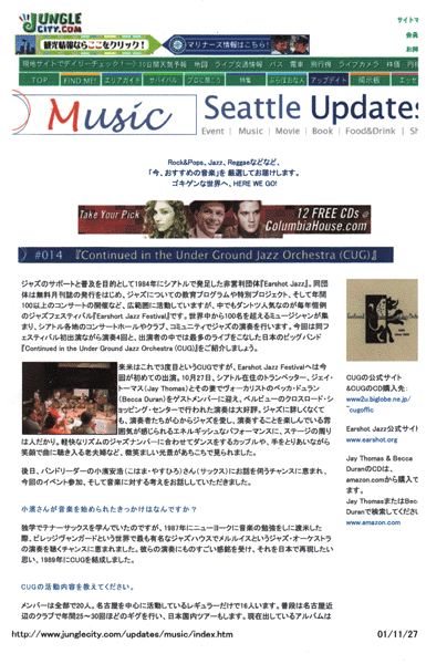 | シアトル発信のサイト。 『CUG-001』の紹介するコーナー。 バンドリーダー小濱安浩が、シアトルでインタビューを受けたが、ここで紹介しているインタビューもその一つ。 |