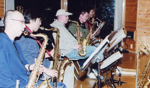 | 何かしらチェックしているサックスセクション。 岡崎・マーク・横山。 後ろで笑顔の中島氏。 |